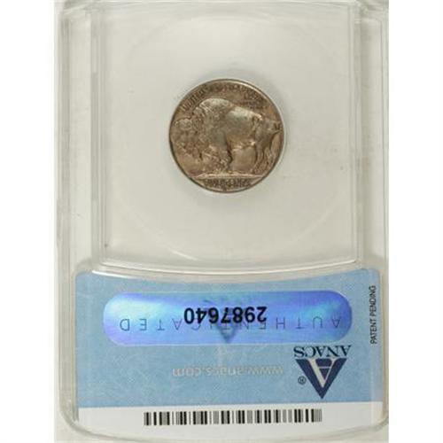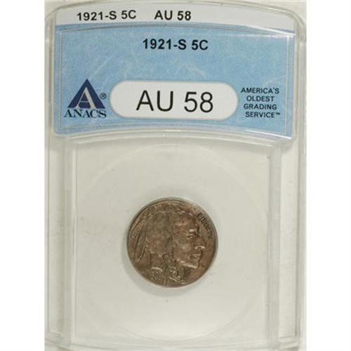 <B>1921-S 5C AU58 ANACS.</B></I> Light golden-gray patination adheres to remarkably clean surfaces on this high-end AU Buffalo. Much better struck than usually seen. A somewhat scarce date in all grades (David Bowers, 2007).<BR><BR><b>Shipping:</b> Coins & Currency (<a target="_blank" href="http://www.heritageauctions.com/common/shipping.php">view shipping information</a>)