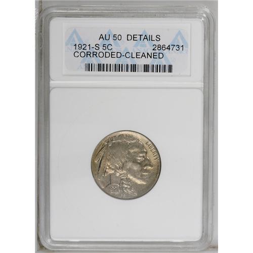 <B>1921-S 5C --Corroded, Cleaned--ANACS. AU50 Details.</B></I> A well struck piece, partially retoned gold, that has subdued, uniform luster. The surfaces exhibit considerable porosity, particularly in the fields.<BR><BR><b>Shipping:</b> Coin/Currency (<a target="_blank" href="http://www.heritageauctions.com/common/shipping.php">view shipping information</a>)