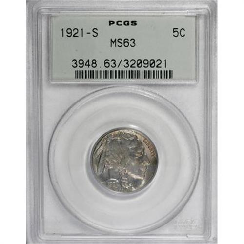<B>1921-S 5C MS63 PCGS.</B></I> This low mintage nickel features original green-gold toning. The hair above the braid has unusually sharp definition, and the date and mintmark are also precisely struck. No marks are noticeable, although tiny carbon flecks are distributed. Encased in an old green label holder.<BR><BR><B>Coin Engraver:</B> James E. Fraser<BR><BR><b>Shipping:</b> Coins & Currency (<a target="_blank" href="http://www.heritageauctions.com/common/shipping.php">view shipping information</a>)