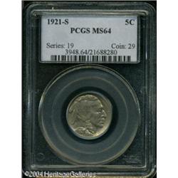 1921-S 5C MS64 PCGS. Not many Buffalo Nickel dates <B>1921-S 5C MS64 PCGS.</B></I> Not many Buffalo Nickel dates can match the 1921-S for rarity in desirable Mint State examples. The San Francisco Mint struck only 1.5 million pieces, the majority of which undoubtedly saw heavy circulation in the absence of nickel production in 1922. This issue was negatively impacted by poor planchet stock, and laminations or other striking problems reduce the desirability of many otherwise well preserved Mint State examples. Thus, we are pleased to offer this attractive near-Gem. With no carbon and nary a distracting blemish to report, this coin has the look of a Gem. The underlying lustrous surfaces are further enhanced by a light coating of opaque gray patina, and the strike is as sharp as one might expect for this issue, with only minor softness on the finer details of the bison. <BR><BR><B>Important notice:</B> Heritage usually auctions material at the rate of 200-250 lots per hour. On some occasions eBay Live bid software or the Internet may not be able to keep up with the pace of the auction. We recommend placing a realistic absentee bid now as insurance to avoid disappointment. Occasionally the auctioneer may eliminate or reject an eBay Live bid, and the auctioneer may also reopen a lot after the close of the eBay live bidding (usually because we missed an audience bid), and may reject your bid even if it shows you as the winning bidder. By bidding via eBay Live, you agree that Heritage may award the lot to another bidder at its sole discretion under the circumstances described above or any other reasonable circumstances. Since eBay bids are not shown to us until we open the lot on the floor, we treat those bids just like floor bids. In most cases the floor responds before the eBay bid is presented to us, due to Internet lag time, so for consistency we have made it a policy that floor bids are always considered first over tie eBay live bids. Also please note that all Heritage lots purchased through eBay Live carry a 20% Buyer's Premium. Please make sure you read the Terms and Conditions before you bid. This lot is being auctioned in conjunction with a live floor auction by Heritage Galleries & Auctioneers. All final auction and invoice information will be supplied by Heritage Galleries & Auctioneers, and all other information should be considered preliminary. Lot:5586