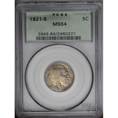 <B>1921-S<5C> MS64 PCGS.</B></I> Rose-red, gold, and lime hues endow this beautiful branch mint near-Gem. The strike is sharp for an S-mint issue from the twenties, although the tail and the top of LIBERTY are slightly soft. Certified in a green label PCGS holder. A popular low mintage date not subject to hoarding.