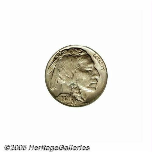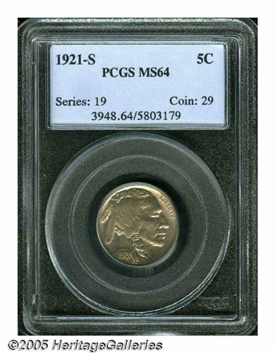 <B>1921-S<5C> MS64 PCGS.</B></I> The low mintage 1921-S Buffalo enjoys strong demand in any Mint State grade and is especially desirable in Choice and better condition. This shimmering, well struck example is tinted in soft champagne-rose and dove-gray shades. A couple of small contact marks are noticed on the Native American's cheekbone and jaw, and some typical weakness is seen on the bison's head. Population: 177 in 64, 57 finer (6/05).