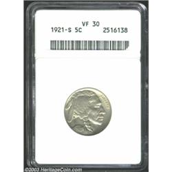 <TABLE cellSpacing=0 cellPadding=0 width="100%" bgColor=#000000 border=0><TBODY><TR><TD width="100%"><TABLE cellSpacing=1 cellPadding=3 width="100%" border=0><TBODY><TR><TD width="100%" bgColor=#79735c><FONT face=arial color=#ffffff size=3><B>Description</B> </FONT></TD></TR><TR><TD width="100%" bgColor=#ffffff><FONT face=arial size=2><B>1921-S 5C VF30 ANACS.</B></I> Lilac and olive-gray hues visit this moderately circulated Nickel. Among the lowest mintage issues in the series.<BR><I>From The V. Michael Collection, Part I.</B></I> </FONT></TD></TR></TBODY></TABLE></TD></TR></TBODY></TABLE><BR><A name=PricesRealized></A><TABLE cellSpacing=0 cellPadding=0 width="100%" bgColor=#000000 border=0><TBODY><TR><TD width="100%"><TABLE cellSpacing=1 cellPadding=3 width="100%" border=0><TBODY><TR><TD width="100%" bgColor=#79735c><A name=PR><FONT face=arial color=#ffffff size=3><B>Previous Prices from Heritage Auctions</B> </FONT></A></TD></TR><TR><TD bgColor=#f6f6ed><TABLE cellSpacing=0 cellPadding=0 width="100%" border=1><TBODY><TR><TD align=middle width="33%"><B>Date</B></TD><TD align=middle width="33%"><B>Service</B></TD><TD align=middle width="33%"><B>Price</B></TD></TR><TR bgColor=whitesmoke><TD width="33%"><B>08/08/2000</B></TD><TD width="33%">PCGS</TD><TD width="33%">$140.00</TD></TR><TR bgColor=whitesmoke><TD width="33%"><B>06/10/2002</B></TD><TD width="33%">NGC</TD><TD width="33%">$379.50</TD></TR><TR bgColor=whitesmoke><TD width="33%"><B>11/25/2002</B></TD><TD width="33%">ANACS</TD><TD width="33%">$218.50</TD></TR><TR bgColor=whitesmoke><TD width="33%"><B>08/06/2003</B></TD><TD width="33%">ANACS</TD><TD width="33%">$414.00</TD></TR></TBODY></TABLE></TD></TR><TR><TD bgColor=#ffffff><FONT face=arial size=1 ?>PLEASE NOTE: All prices realized reflect the final hammer price PLUS the buyer's premium in auctions that charge a buyer's premium. Each item has a notation at the top of the listing indicating whether that lot included a buyer's premium. Example: A item that sells with a final hammer price of $100 and a 20% buyer's premium will display with a price realized of $120. All information listed is intended to be as accurate as possible, but errors are possible. Please use this guide carefully and inform us of any inaccuracies. </FONT></TD></TR></TBODY></TABLE></TD></TR></TBODY></TABLE><BR><TABLE cellSpacing=0 cellPadding=0 width="100%" bgColor=#000000 border=0><TBODY><TR><TD width="100%"><TABLE cellSpacing=1 cellPadding=3 width="100%" border=0><TBODY><TR><TD width="100%" bgColor=#79735c colSpan=6><FONT face=arial color=#ffffff size=3><B>Price Guide*</B> </FONT></TD></TR><TR bgColor=#f6f6ed><TD align=middle><B>Grade</B> </TD><TD align=middle><B>Coin World<BR>(Trends)</B> </TD><TD align=middle><B>Numismedia<BR>Retail</B> </TD><TD align=middle><B>Numismedia<BR>Wholesale</B> </TD><TD align=middle><B>Coin<BR>Universe</B> </TD><TD align=middle><B>Heritage<BR>Value Index</B> </TD></TR><TR bgColor=#ffffff><TD align=middle>25</TD><TD align=right>---</TD><TD align=right>---</TD><TD align=right>---</TD><TD align=right>---</TD><TD align=right>$328.97</TD></TR><TR style="FONT-WEIGHT: bold" bgColor=#cccfdd><TD align=middle>30</TD><TD align=right>---</TD><TD align=right>---</TD><TD align=right>---</TD><TD align=right>---</TD><TD align=right>$383.81</TD></TR><TR bgColor=#ffffff><TD align=middle>35</TD><TD align=right>---</TD><TD align=right>---</TD><TD align=right>---</TD><TD align=right>---</TD><TD align=right>$454.88</TD></TR><TR bgColor=#ffffff><TD colSpan=6><FONT size=1>*All information listed is intended to be as accurate as possible, but errors are possible. No item may be returned or refused based on this information which is provided as a service to our customers. You should contact each pricing source directly to determine the accuracy of this information. </FONT></TD></TR></TBODY></TABLE></TD></TR></TBODY></TABLE><BR><TABLE cellSpacing=0 cellPadding=0 width="100%" bgColor=#000000 border=0><TBODY><TR><TD width="100%"><TABLE cellSpacing=1 cellPadding=3 width="100%" border=0><TBODY><TR><TD width="100%" bgColor=#79735c><FONT face=arial color=#ffffff size=3><B>Population Guide</B> </FONT></TD></TR><TR bgColor=#ffffff><TD align=middle><!-- Begin Output of Population Grid--><TABLE cellSpacing=0 cellPadding=0 width="100%" border=0><TBODY><TR><TD vAlign=center><TABLE cellSpacing=0 width="100%" border=1 cellsadding="3"><TBODY><TR><TD vAlign=center><TABLE cellSpacing=0 cellPadding=3 width="100%" border=1><TBODY><TR><TD vAlign=center align=middle bgColor=#f0f1e8 colSpan=2 <CENTER><FONT face=Arial size=2><B>PCGS Pop </B></FONT><CENTER></CENTER></TD><TD vAlign=center align=middle bgColor=#f0f1e8 colSpan=2><CENTER><FONT face=Arial size=2><B>NGC Pop</B></CENTER></FONT></TD></TR><TR><TD vAlign=center><FONT face=Arial size=2>(30)</FONT> </TD><TD vAlign=center align=right><FONT face=Arial size=2>19</FONT> </TD><TD vAlign=center><FONT face=Arial size=2>(30)</FONT> </TD><TD vAlign=center align=right><FONT face=Arial size=2>17</FONT> </TD></TR><TR><TD vAlign=center><FONT face=Arial size=2>(>30)</FONT> </TD><TD vAlign=center align=right><FONT face=Arial size=2>404</FONT> </TD><TD vAlign=center><FONT face=Arial size=2>(>30)</FONT> </TD><TD vAlign=center align=right><FONT face=Arial size=2>185</FONT> </TD></TR></TBODY></TABLE></TD></TR></TBODY></TABLE></TD></TR></TBODY></TABLE><!-- End Output of Population Grid--> Important notice: Heritage usually auctions material at the rate of 200-250 lots per hour. On some occasions eBay Live bid software or the Internet may not be able to keep up with the pace of the auction. We recommend placing a realistic absentee bid now as insurance to avoid disappointment. Occasionally the auctioneer may eliminate or reject an eBay Live bid, and the auctioneer may also reopen a lot after the close of the eBay live bidding (usually because we missed an audience bid), and may reject your bid even if it shows you as the winning bidder. By bidding via eBay Live, you agree that Heritage may award t