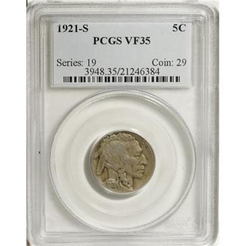 <B>1921-S 5C VF35 PCGS.</B></I> Scarce in all grades and especially challenging in VF. This piece is better detailed on the obverse than the reverse. Light gray accents on the highpoints with deeper, charcoal color around the peripheries and within the recesses.<BR><BR><B>Coin Engraver:</B> James E. Fraser<BR><BR><b>Shipping:</b> Coins & Currency (<a target="_blank" href="http://www.heritageauctions.com/common/shipping.php">view shipping information</a>)