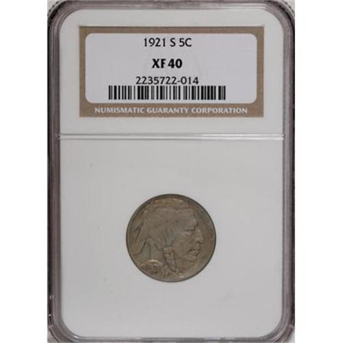 <B>1921-S 5C XF40 NGC.</B></I> Crisply struck for this San Francisco issue, with particularly impressive definition on the Indian's hair. Light, even wear with golden-tan and rose-orange patina over each side.<BR><BR><B>Coin Engraver:</B> James E. Fraser<BR><BR><b>Shipping:</b> Coins & Currency (<a target="_blank" href="http://www.heritageauctions.com/common/shipping.php">view shipping information</a>)