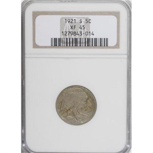 <B>1921-S 5C XF45 NGC.</B></I> Light grayish-tan with speckled russet and iridescent aqua toning. Evenly worn with only the tip of the bison's horn lacking complete definition. A rare XF example of this desirable S-mint Buffalo nickel. <BR><BR><b>Shipping:</b> Coins & Currency (<a target="_blank" href="http://www.heritageauctions.com/common/shipping.php">view shipping information</a>)