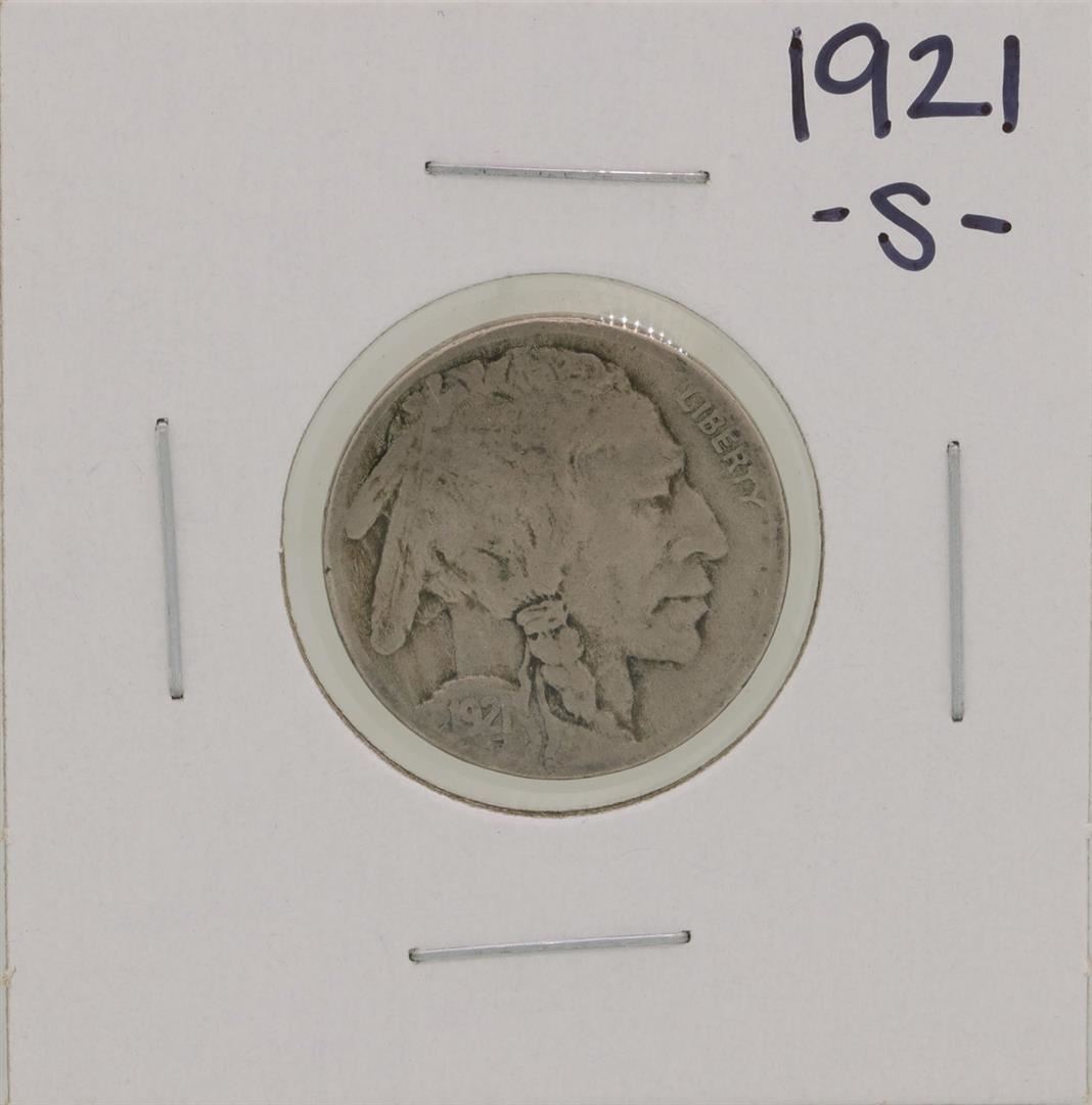 One 1921-S Buffalo Nickel Coin.