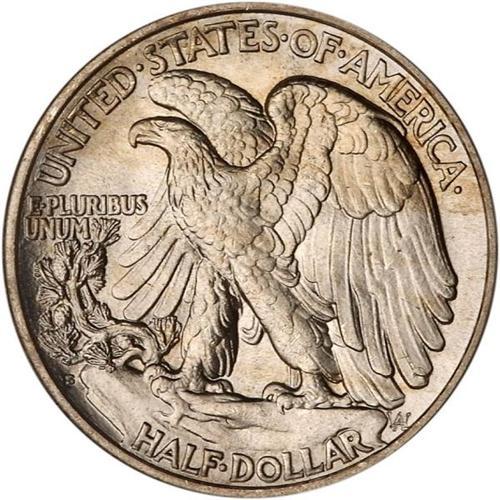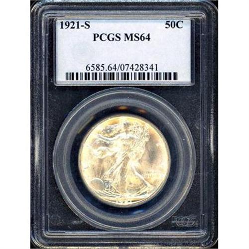 <b>1921-S Liberty Walking Half Dollar. PCGS graded MS64.</b> Only 548,000 pieces were struck of this scarce, key date, and it is seldom encountered in strict Choice MS64 condition. While often known as a strike rarity, as are other key issues are of the teens and twenties, the 1921-S is definitely elusive with sharp details on Liberty's head and features. This particular piece shows almost complete definition on the obverse, while the reverse has the usual softness but only on the left side of the eagle's leg. The luster on this coin is strong and outstanding, being satin-like and smooth as the coin is turned under incandescent light. Originally and lightly toned with a light gray to golden cast over each side and splashes accents of pastel-brown on the reverse.