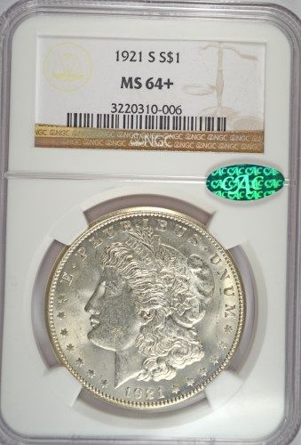 1921-S MORGAN SILVER DOLLAR, NGC MS-64+ CAC APPROVED! SUPER!!