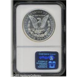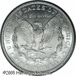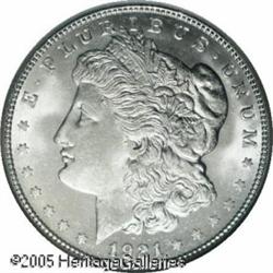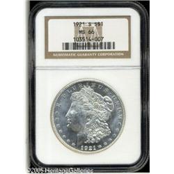 <B>1921-S<img border='0' src='http://www.heritagecoins.com/images/star.gif' width=10 height=10>$1 MS66 NGC.</B></I> A prized find at the Gem grade tier, the San Francisco mint's contribution is the most conditionally challenging of the three 1921 Morgan Dollars. While the balance of the features display razor sharp delineation, we call attention to typical striking weakness only on the lower wreath. The untoned, nearly mark-free surfaces allow for full appreciation of this beautiful example. Population: 32 in 66, 1 finer (1/05).<BR><I>From The Banks Collection.</B></I> Lot:10644