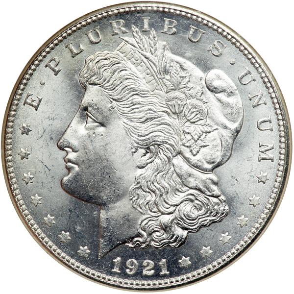 1921-S Morgan Dollar. NGC graded MS-65. Well struck and totally white, a desirable Gem BU example of this final S-mint release for the Morgan Dollar design which lasted from 1878 until 1921 (PCGS # 7300) .