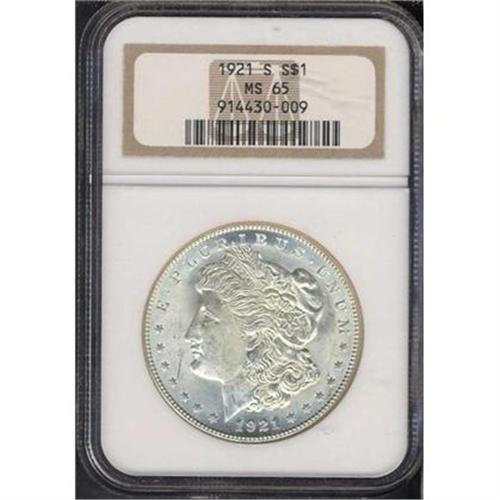 <b>1921-S Morgan Dollar. NGC graded MS65.</b> A faint hairline-thin scuff in the frost left of Liberty. This is a pleasing, highly lustrous 1921-S Morgan dollar with a few grade-limiting luster grazes or bagmarks. Sharply struck, too, from a faithful full blow by the dies <b>(PCGS # 7300)</b>