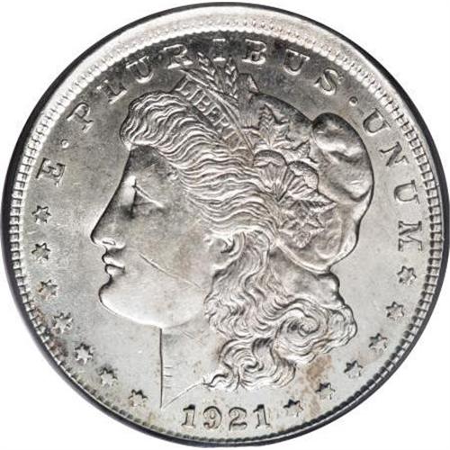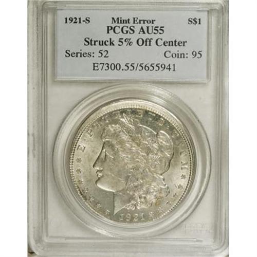 <B>1921-S $1 Morgan Dollar--Struck 5% Off Center--AU55 PCGS.</B></I> Off center toward 6 o'clock, but the date is complete, as is the mintmark. A relatively broad area of unstruck surface is present near 12 o'clock. The devices show slight friction. The strike is unusually sharp for a '21-S, since the collar die was absent, allowing the obverse and reverse dies to further approach.<BR><I>From The Vanek Collection.</B></I><BR><BR><b>Shipping:</b> Coins & Currency (<a target="_blank" href="http://www.heritageauctions.com/common/shipping.php">view shipping information</a>)