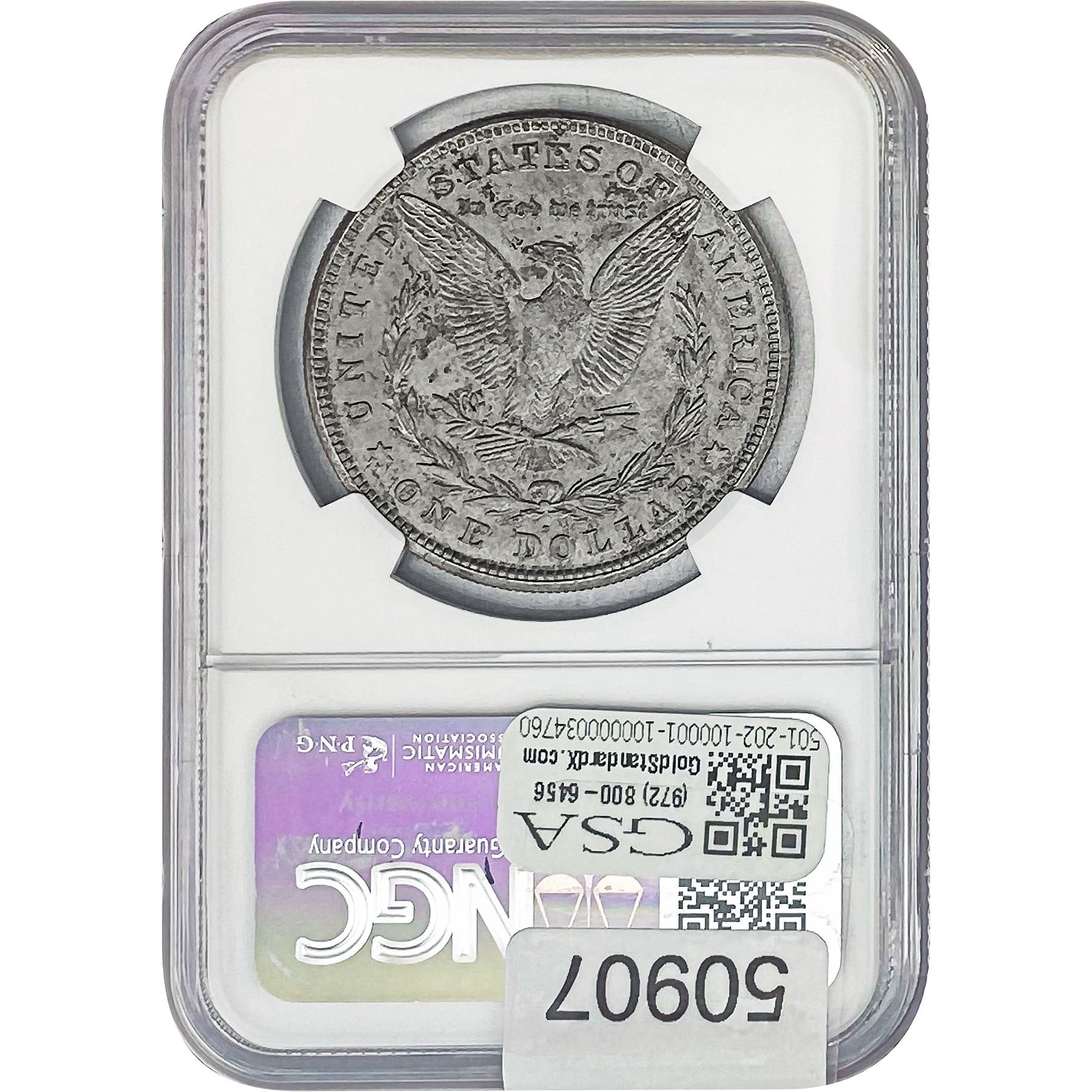 e. Coins sold referencing a third-party grading service are sold “AS IS” without any express or implied warranty, except for a guarantee by GSA that they are genuine. Removal or alteration of the holder, voids all of Bidder’s claims concerning that Product. Certain warranties may be available from the grading services and Bidders are referred to them for further details: Numismatic Guaranty Corporation (NGC), PO Box 4776, Sarasota, FL 34230, www.ngccoin.com/services/writtenguarantee.asp; Professional Coin Grading Services (PCGS), PO Box 9458, Newport Beach, CA 92658, www.pcgs.com/guarantee.html; ANACS, 6555 S. Kenton St., Ste. 303, Englewood, CO 80111; and Independent Coin Grading Co. (ICG), 7901 East Bellview, Ave., Suite 50, Englewood, CO 80111.