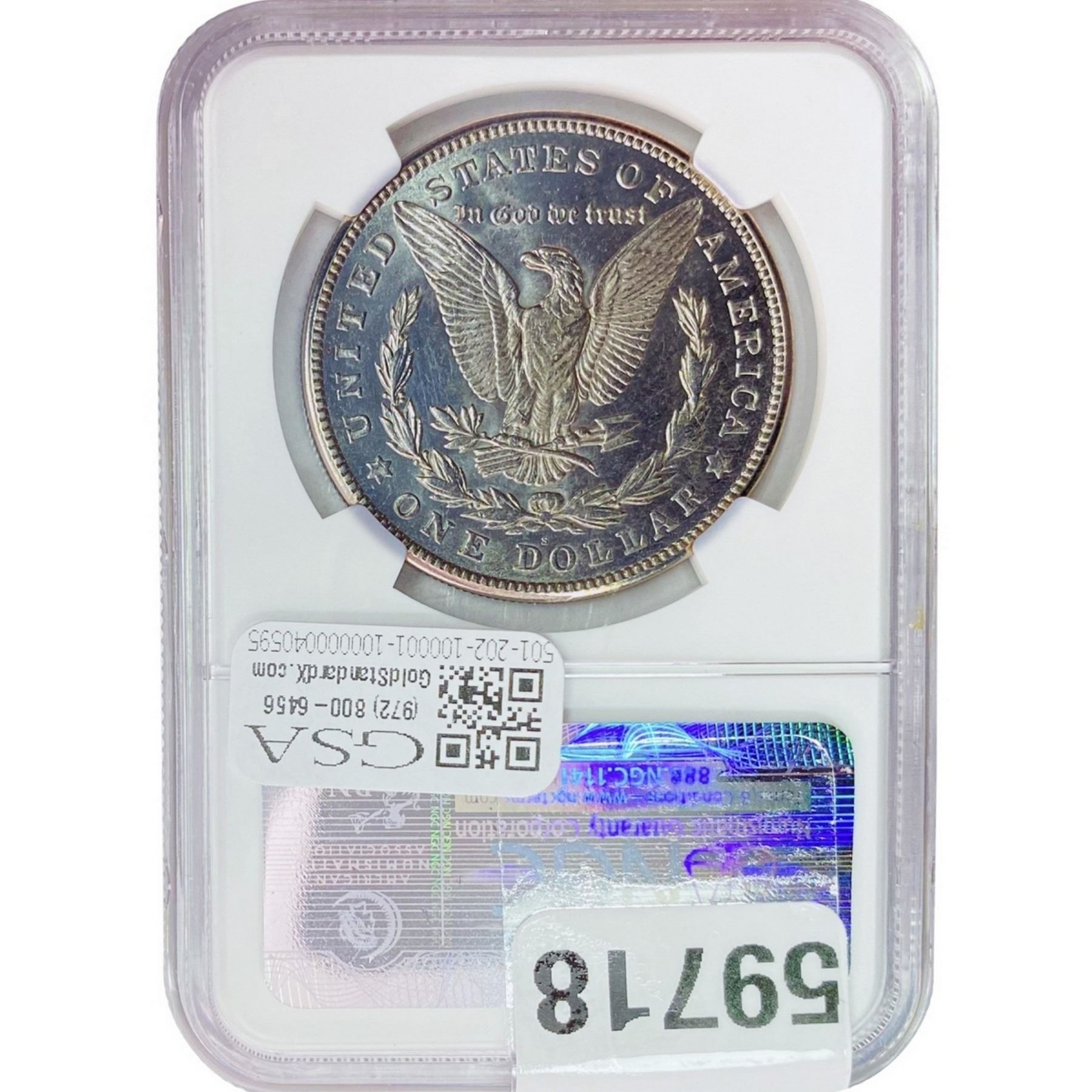 e. Coins sold referencing a third-party grading service are sold “AS IS” without any express or implied warranty, except for a guarantee by GSA that they are genuine. Removal or alteration of the holder, voids all of Bidder’s claims concerning that Product. Certain warranties may be available from the grading services and Bidders are referred to them for further details: Numismatic Guaranty Corporation (NGC), PO Box 4776, Sarasota, FL 34230, www.ngccoin.com/services/writtenguarantee.asp; Professional Coin Grading Services (PCGS), PO Box 9458, Newport Beach, CA 92658, www.pcgs.com/guarantee.html; ANACS, 6555 S. Kenton St., Ste. 303, Englewood, CO 80111; and Independent Coin Grading Co. (ICG), 7901 East Bellview, Ave., Suite 50, Englewood, CO 80111.