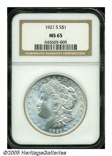 <B>1921-S<S$1> MS65 NGC.</B></I> A brilliant and highly lustrous Gem that has an above average strike, especially on the wreath. A lovingly preserved Gem.