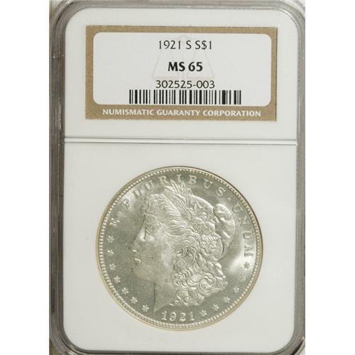 <B>1921-S S$1 MS65 NGC.</B></I> A subtly gold-tinted Gem representative of this final-year issue that displays above-average definition and luster. The lovely fields display few marks for the grade.<BR><BR><b>Shipping:</b> Coins & Currency (<a target="_blank" href="http://www.heritageauctions.com/common/shipping.php">view shipping information</a>)