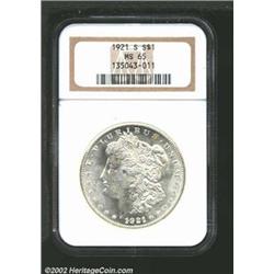 1921-S S$1 MS65 NGC. Brilliant white and well defined with no notable flaws and a superior overall appearance. Important notice: We expect to be auctioning lots at the rate of 200-250 per hour. Sometimes eBay Premier live bid software cannot keep up with that pace, so we strongly recommend that you place a realistic proxy bid now as insurance to avoid disappointment. Also please note that all Heritage/CAA lots purchased through eBay Premier carry a 20% Buyer's Premium.
