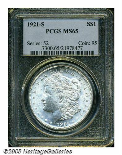 <B>1921-S<S$1> MS65 PCGS.</B></I> A misunderstood and often overlooked Morgan dollar issue, the '21-S is a truly scarce commodity at the Gem grade level. This piece is fully brilliant and displays superior luster.