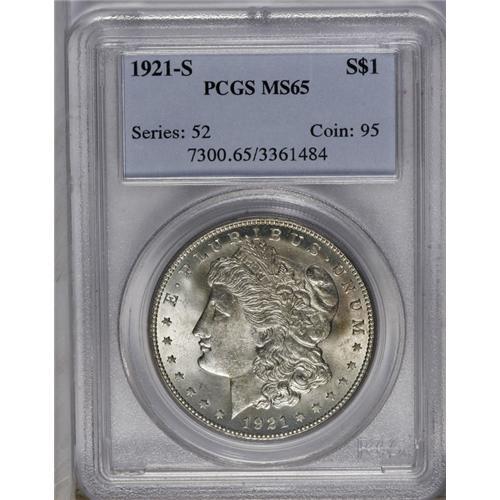 <B>1921-S<img border='0' src='http://www.heritagecoins.com/images/star.gif' width=10 height=10>$1> MS65 PCGS.</B></I> Boldly struck and well preserved, with a highly effulgent sheen and only hints of color on either side. A visually alluring Gem, from the final year of the Morgan silver dollar series.