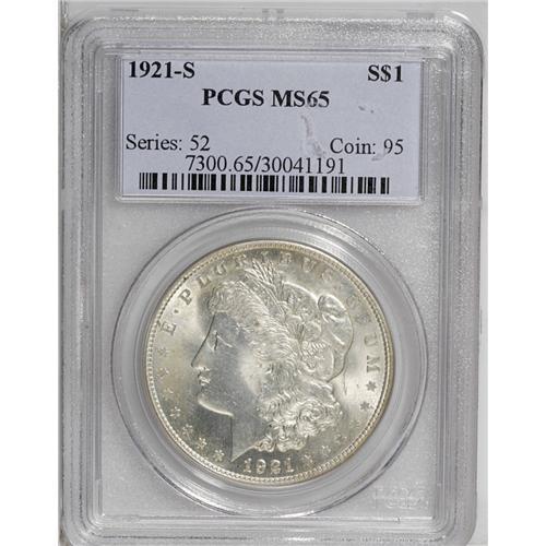 <B>1921-S<img border='0' src='http://www.heritagecoins.com/images/star.gif' width=10 height=10>$1> MS65 PCGS.</B></I> Excellent luster and lightly toned with virtually no distracting blemishes as often seen on the 1921 issues. Softly struck, as usual, on the eagle's breast on the reverse.