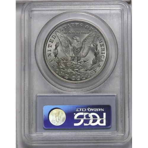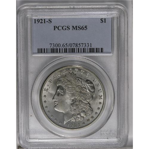 <B>1921-S<img border='0' src='http://www.heritagecoins.com/images/star.gif' width=10 height=10>$1> MS65 PCGS.</B></I> The satiny fields are mostly untoned, as are the devices; small patches of russet can be found near stars 11 and 12. The mostly full strike is slightly weak above the ear.
