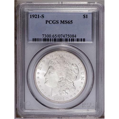 <B>1921-S<img border='0' src='http://www.heritagecoins.com/images/star.gif' width=10 height=10>$1> MS65 PCGS.</B></I> This is a wonderful Gem example with frosty silver luster. A few scattered marks are visible on Liberty's cheek and elsewhere on the obverse. The reverse is pristine and at least a grade point finer in quality. <BR><BR><B>Important notice:</B> Heritage usually auctions material at the rate of 200-250 lots per hour. On some occasions eBay Live bid software or the Internet may not be able to keep up with the pace of the auction. We recommend placing a realistic absentee bid now as insurance to avoid disappointment. Occasionally the auctioneer may eliminate or reject an eBay Live bid, and the auctioneer may also reopen a lot after the close of the eBay live bidding (usually because we missed an audience bid), and may reject your bid even if it shows you as the winning bidder. By bidding via eBay Live, you agree that Heritage may award the lot to another bidder at its sole discretion under the circumstances described above or any other reasonable circumstances. Since eBay bids are not shown to us until we open the lot on the floor, we treat those bids just like floor bids. In most cases the floor responds before the eBay bid is presented to us, due to Internet lag time, so for consistency we have made it a policy that floor bids are always considered first over tie eBay live bids. Also please note that all Heritage lots purchased through eBay Live carry a 20% Buyer's Premium. Please make sure you read the Terms and Conditions before you bid. This lot is being auctioned in conjunction with a live floor auction by Heritage Galleries & Auctioneers. All final auction and invoice information will be supplied by Heritage Galleries & Auctioneers, and all other information should be considered preliminary. Lot:3797 <BR><BR><B>Winning Notification and Billing:</B> After the FINAL session in this auction is complete, Heritage will send e-mail and snail mail invoices. This process normally takes several days. All final auction and invoice information will be supplied by Heritage Galleries & Auctioneers, and all other information should be considered preliminary. <BR><BR>This auction will be conducted on a live auction floor and over the Internet through eBay Live. If you choose to place an absentee bid, please take a moment to <font color='#0000ff'><u><a href='http://pages.ebay.com/liveauctions/help/before/laabsentee.html'>learn how eBay Live absentee bidding works</a></u></font><font color='#000000'>