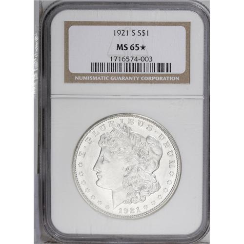 <B>1921-S<img border='0' src='http://www.heritagecoins.com/images/star.gif' width=10 height=10>$1> MS65 <img border='0' src='http://www.heritagecoins.com/images/star.gif' width=10 height=10> NGC.</B></I> A stone-white Gem with an above average strike and a prooflike obverse. A common date in Mint State, but Gems with attractive strikes are scarce. Population: 16 in 65 <img border='0' src='http://www.heritagecoins.com/images/star.gif' width=10 height=10>, 3 finer (6/06).<BR><I>From The New York Eye Appeal Collection.</B></I>