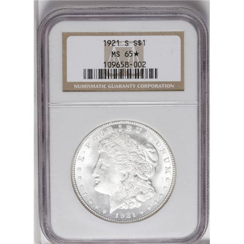 <B>1921-S<img border='0' src='http://www.heritagecoins.com/images/star.gif' width=10 height=10>$1> MS65 <img border='0' src='http://www.heritagecoins.com/images/star.gif' width=10 height=10> NGC.</B></I> NGC has awarded a Star designation to this Gem for two reasons. It is fully brilliant, and the strike is decidedly above average, particularly on the usually mushy wreath. Generally smooth, although the cheek shows faint grazes.
