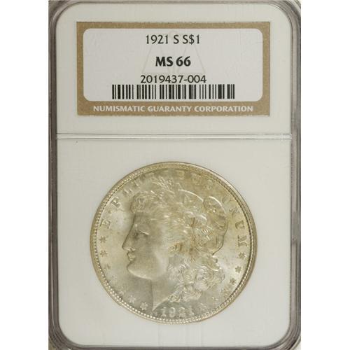 <B>1921-S S$1 MS66 NGC.</B></I> Inadequate striking definition and numerous detracting bagmarks are the two most notorious features that limit the grade of extant 1921-S Morgan Dollars. As a result, this issue is a noteworthy condition rarity in the finer Mint State grades despite a generous original mintage of 21.6 million pieces. A refreshingly smooth, faintly toned example. Census: 42 in 66, 1 finer (4/07).<BR><BR><b>Shipping:</b> Coins & Currency (<a target="_blank" href="http://www.heritageauctions.com/common/shipping.php">view shipping information</a>)