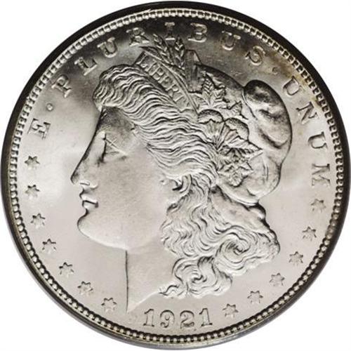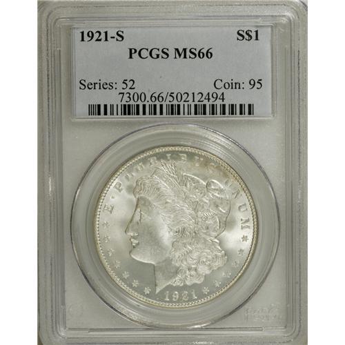 <B>1921-S S$1 MS66 PCGS.</B></I> The 1921-S is a high mintage issue with more than 21 million pieces produced. In spite of the thousands and thousands of coins that were saved, this issue was apparently roughly handled and high grade examples are seldom seen. It is unusual that we have two MS66 examples in this auction. This piece shows the usual bright mint frost. The surfaces are completely brilliant and, of course, show no noticeable abrasions. Sharply struck for the issue with only a couple of the leaves on the wreath showing softness. Census: 41 in 66, 1 finer (1/07).<BR><BR><b>Shipping:</b> Coins & Currency (<a target="_blank" href="http://www.heritageauctions.com/common/shipping.php">view shipping information</a>)
