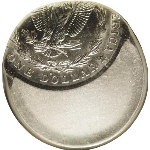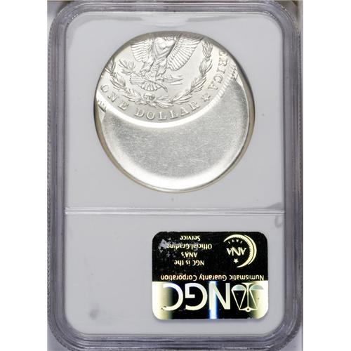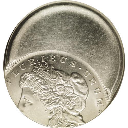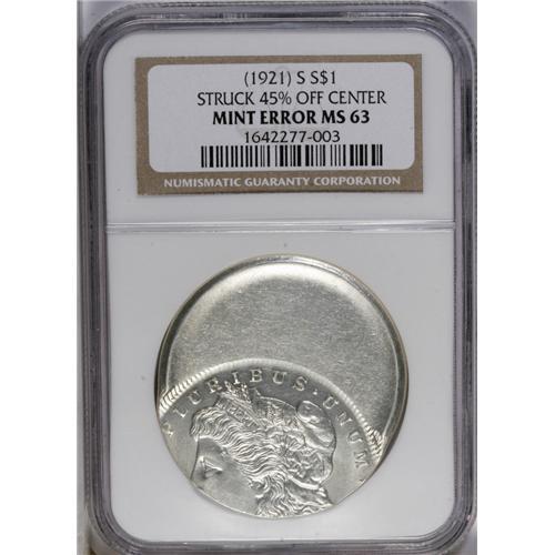 <B>1921-S<img border='0' src='http://www.heritagecoins.com/images/star.gif' width=10 height=10>$1> Morgan Dollar--Struck 45% Off Center--MS63 NGC.</B></I> Struck off-center at 6:30. The reverse is rotated about 45 degrees clockwise. Although the date is not visible due to the direction of the off-center strike, this example is clearly identified as a 1921-S issue due to the distinctive design characteristics seen only on this issue. A few faint hairlines are visible over satiny luster. Both sides are fully brilliant with traces of pale champagne toning. It is seldom the case that Morgan silver dollars are found off-center to this degree.