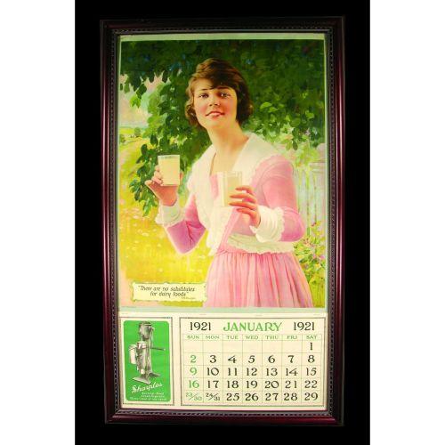 1921 Sharples Cream Separator Calendar. Framed under glass, full pad, small tears at 11/12:00 in border otherwise excellent condition. 17 X 30 inches.