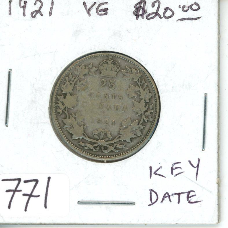 1921 Silver 25 Cents. Key Date. Mintage of 597,337. VG-8.