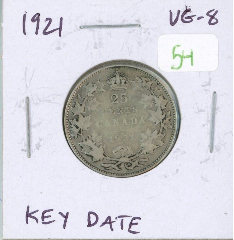 1921 Silver 25 Cents. Key Date. Mintage of 597,337. VG-8.