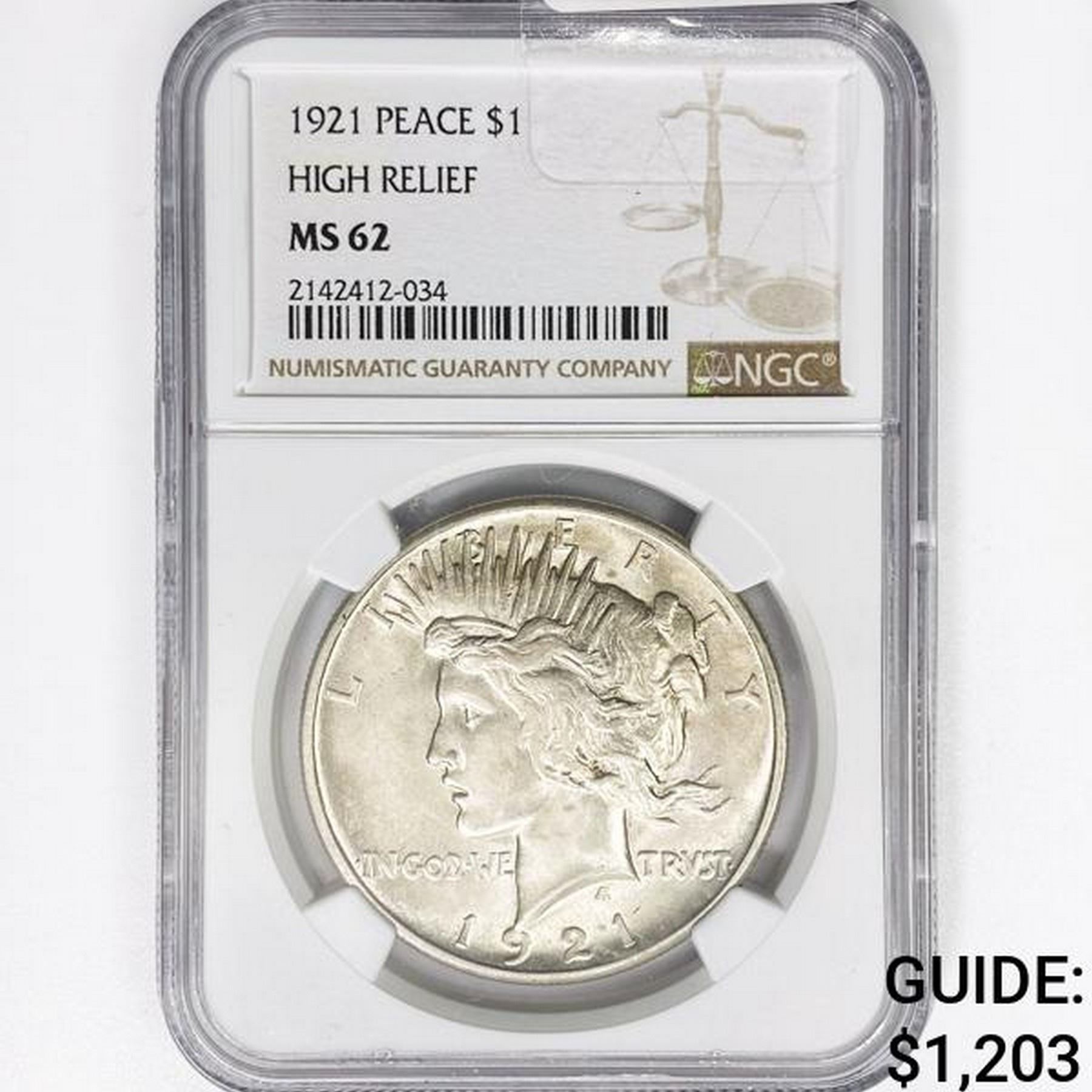 1921 Silver Peace Dollar NGC MS62 High Relief