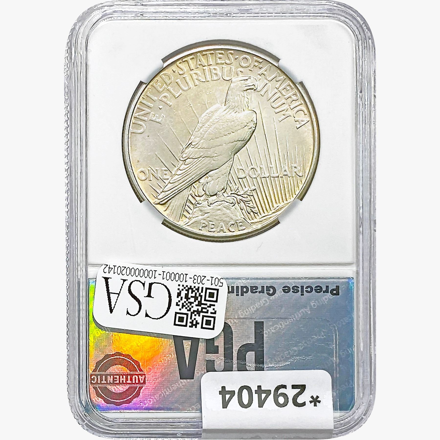 l. All non-certified coins and currency are guaranteed genuine, but are not guaranteed as to grade, since grading is a matter of opinion, an art and not a science, and therefore the description rendered by GSA or any third-party grading service may not agree with the opinion of others (including trained experts), and the same expert may not grade the same item with the same grade at two different times. GSA may, but is not obligated to, express an opinion as to non-certified numismatic items, in GSA’s opinion, or by its employees’ experience and the current interpretation of the American Numismatic Association’s standards as of the date the catalog was prepared. There is no guarantee or warranty expressed or implied that the grading opinions utilized by GSA, if any, will meet the standards of any grading service at any time in the future.