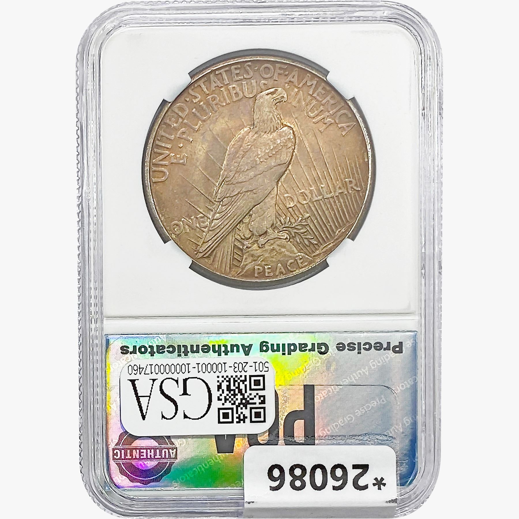 COINS AND CURRENCY LISTED IN GSA’S CATALOG AS GRADED AND ENCAPSULATED BY PCGS, NGC, ANACS, ICG, PCGS CURRENCY, PMG, PCGS BANKNOTE GRADING, CMC OR ANY OTHER THIRD-PARTY GRADING SERVICE ARE LIKEWISE SOLD “AS-IS” EXCEPT AS EXPRESSLY SET FORTH HEREIN. ALL THIRD-PARTY GRADING SERVICE GUARANTEES, INCLUDING AUTHENTICITY, ARE THE SOLE RESPONSIBILITY OF THE THIRD-PARTY GRADING SERVICE AND NOT WARRANTIES OR GUARANTEES OF GSA. BIDDERS SHOULD CONTACT THESE THIRD-PARTY GRADING SERVICES DIRECTLY WITH RESPECT TO ANY CLAIMS OR QUESTIONS THEY MAY HAVE CONCERNING THEIR GUARANTEES AND WARRANTIES. BIDDERS ACKNOWLEDGE AND AGREE THAT AUCTIONEER IS NOT BOUND BY OR LIABLE FOR ANY OPINION OR CERTIFICATION BY ANY THIRD-PARTY GRADING SERVICE. REMOVAL OF A PRODUCT FROM ITS PROTECTIVE CASING OR HOLDER OR ALTERATION OF ANY COIN HOLDER WAIVES ALL RIGHTS CONCERNING THE PRODUCT CONTAINED THEREIN.