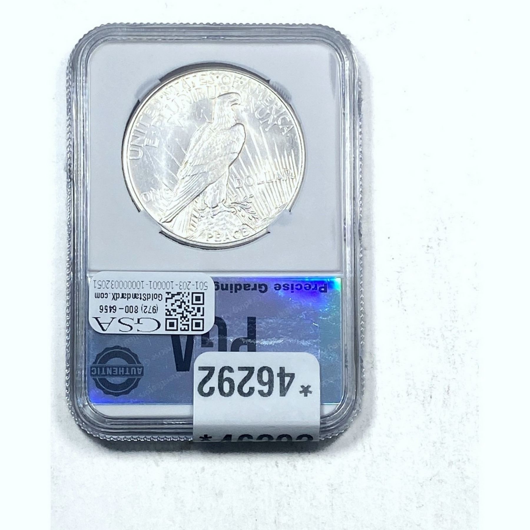 l. All non-certified coins and currency are guaranteed genuine, but are not guaranteed as to grade, since grading is a matter of opinion, an art and not a science, and therefore the description rendered by GSA or any third-party grading service may not agree with the opinion of others (including trained experts), and the same expert may not grade the same item with the same grade at two different times. GSA may, but is not obligated to, express an opinion as to non-certified numismatic items, in GSA’s opinion, or by its employees’ experience and the current interpretation of the American Numismatic Association’s standards as of the date the catalog was prepared. There is no guarantee or warranty expressed or implied that the grading opinions utilized by GSA, if any, will meet the standards of any grading service at any time in the future.