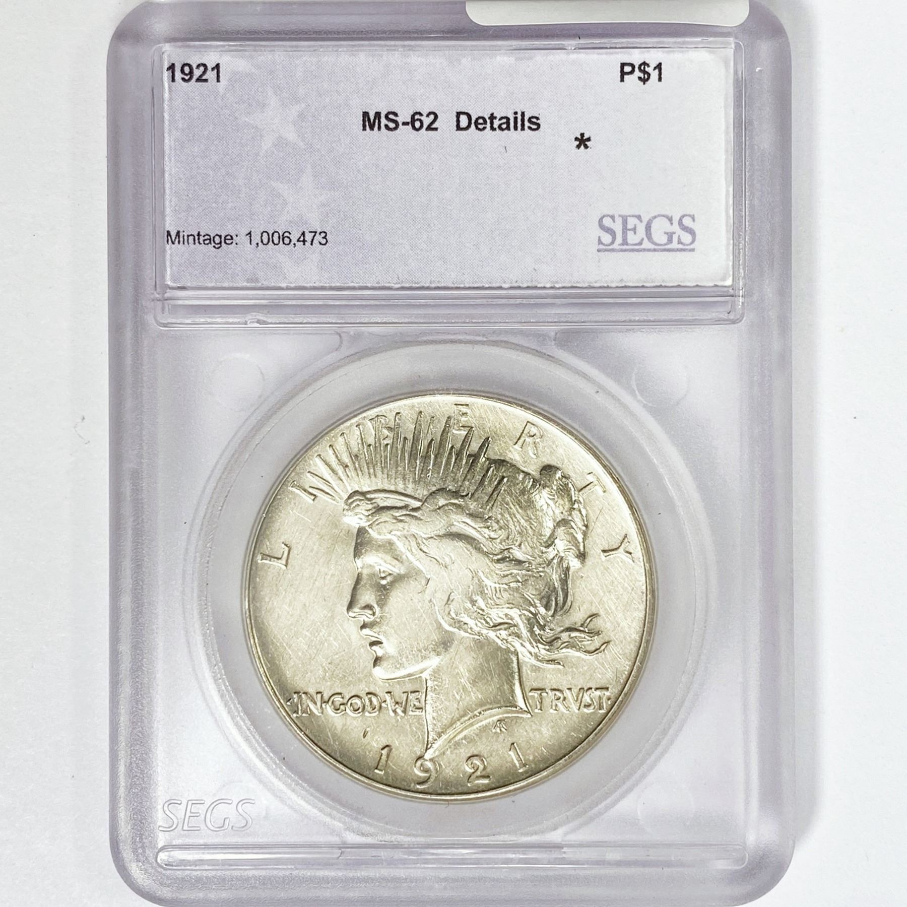 1921 Silver Peace Dollar SEGS MS62 Details