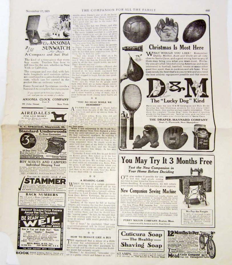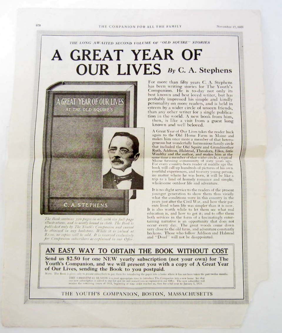 "A Great Year of Our Lives" by C. A. Stephens is promoted on One (1) side and lots of advertisements on the other side.