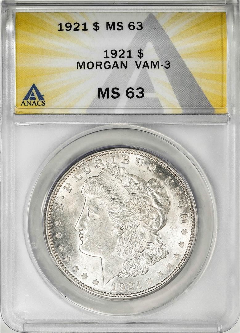 One 1921 VAM-3 $1 Morgan Silver Dollar Coin ANACS MS63. ANACS Certified.