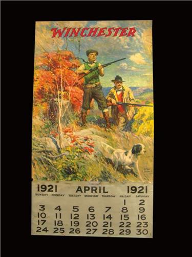 1921 Winchester Calendar, original top band, April page only. Arthur Fuller artist depicting father and son hunting. Framed and matted. Hole at 12:00, minor staining and crease, small paper loss at 4/7:00, tack holes in pad otherwise very good original condition. Image 14 1/2 X 27 inches.