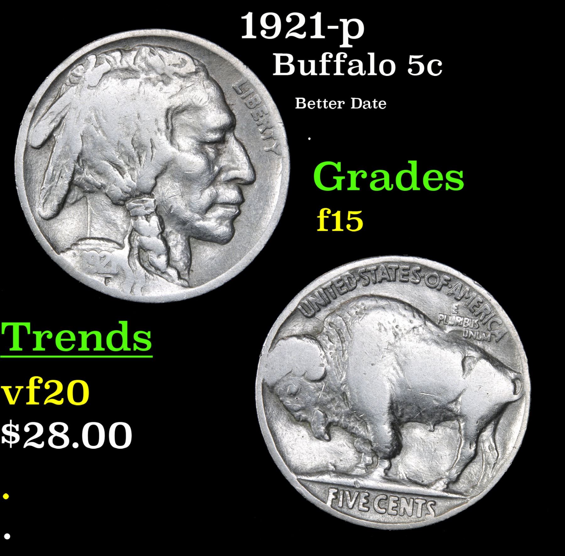 1921-p Better Date . Buffalo Nickel 5c Grades f+.