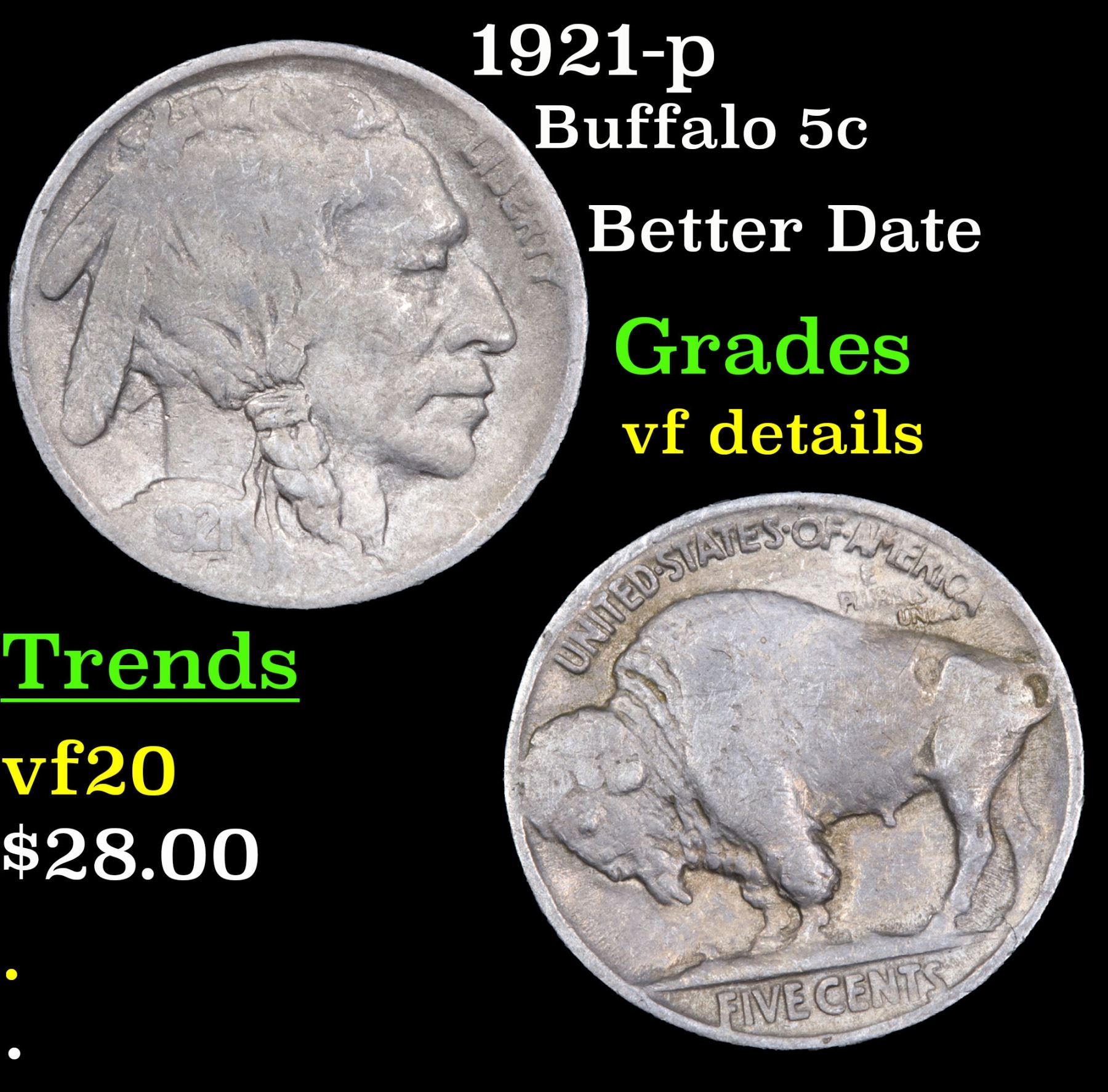 1921-p Buffalo Nickel 5c Grades vf details.