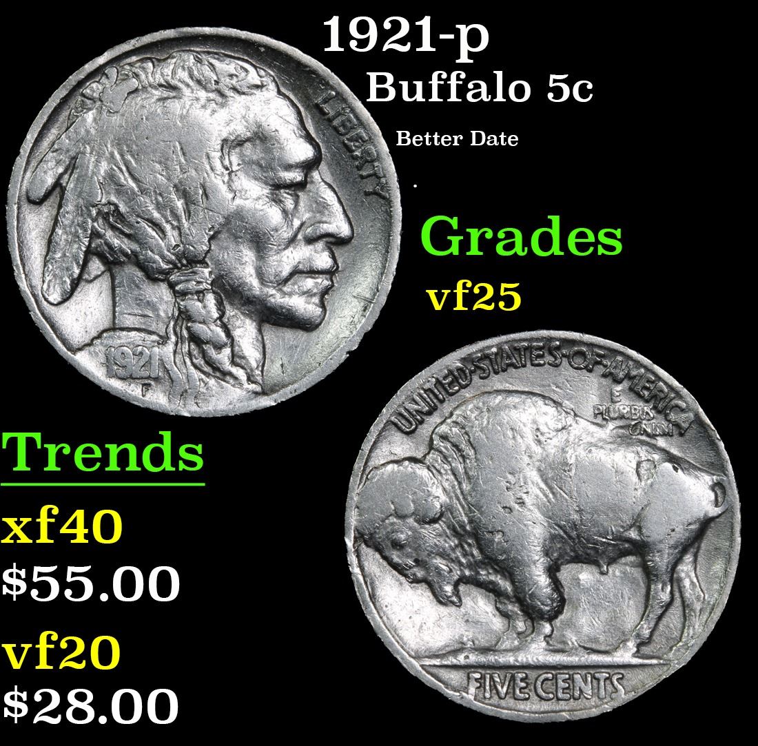 1921-p Better Date . Buffalo Nickel 5c Grades vf+.