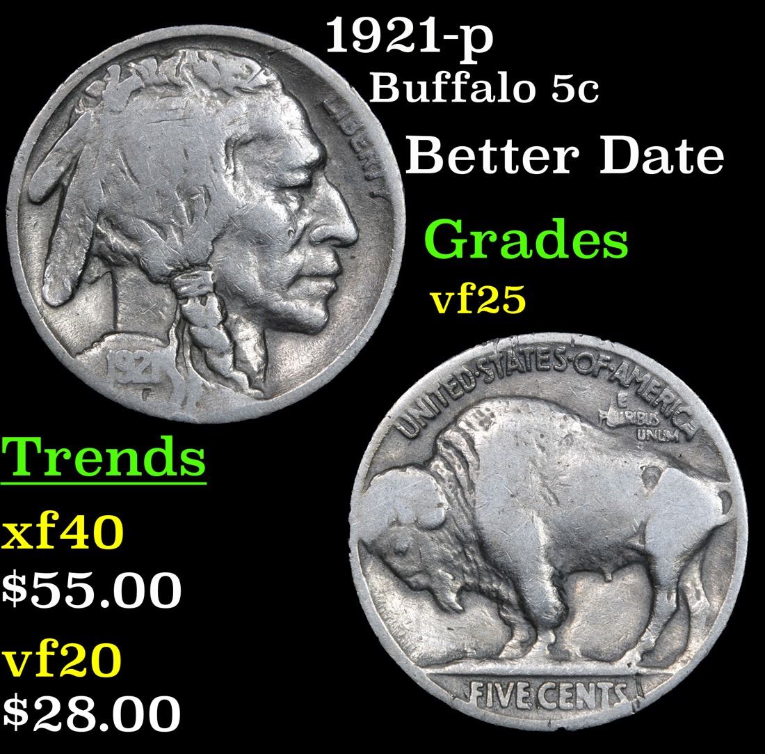 1921-p Better Date . Buffalo Nickel 5c Grades vf+.