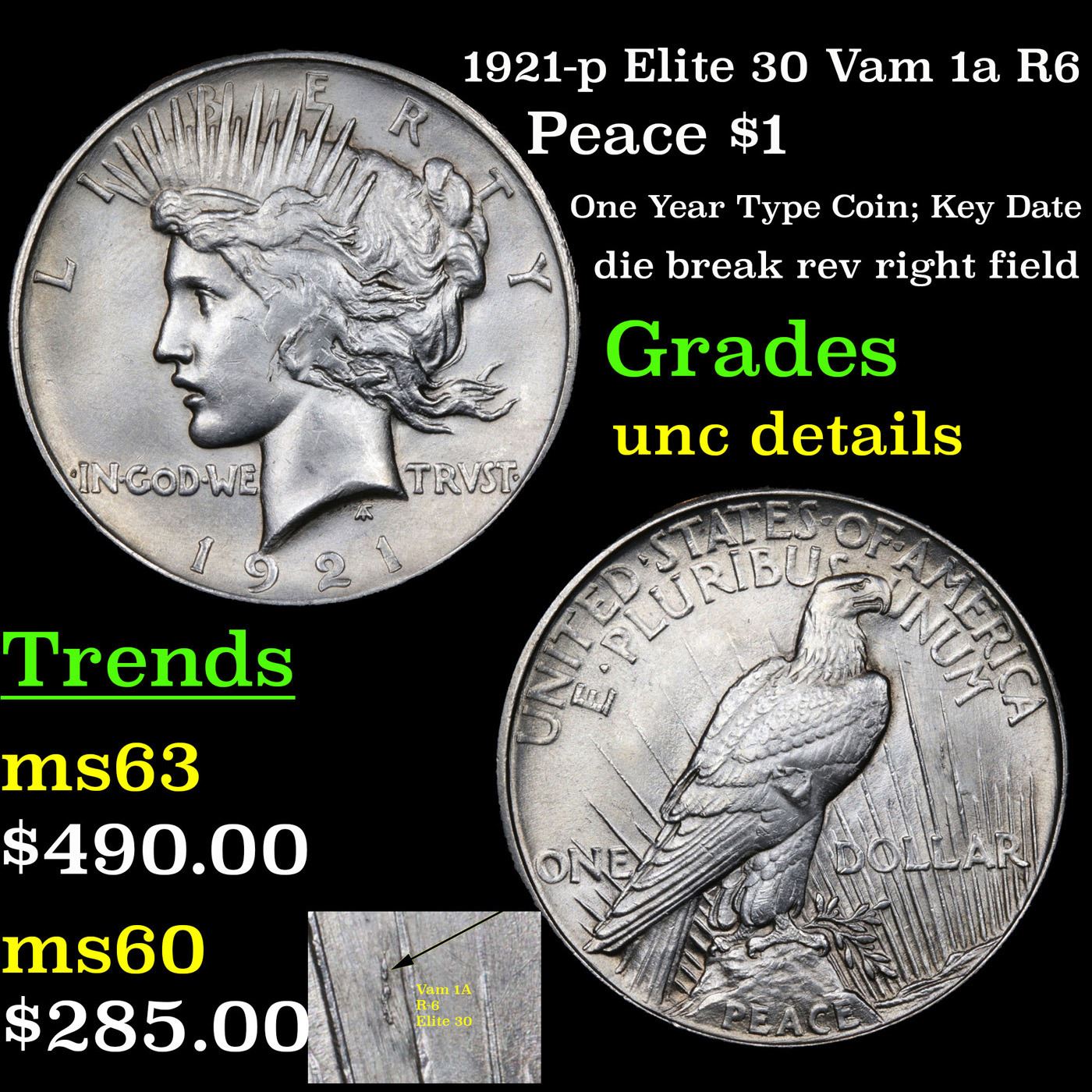1921-p Elite 30 Vam 1a R6 Peace Dollar $1 Grades Unc Details.