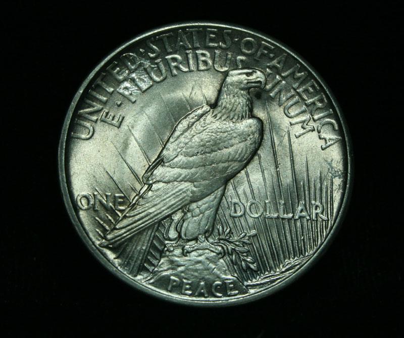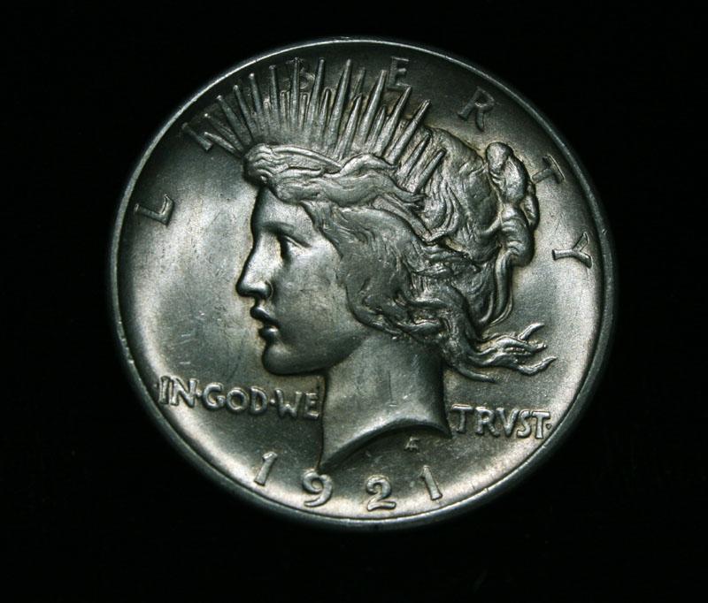 An attractive 1921 High Relief Peace Dollar, nice attractive luster. Great eye appeal. Decent Strike. Coin World's Coin Values lists ms64 at $750 and The Wholesale Greysheet lists ms64 at $600. Estimated Value $650