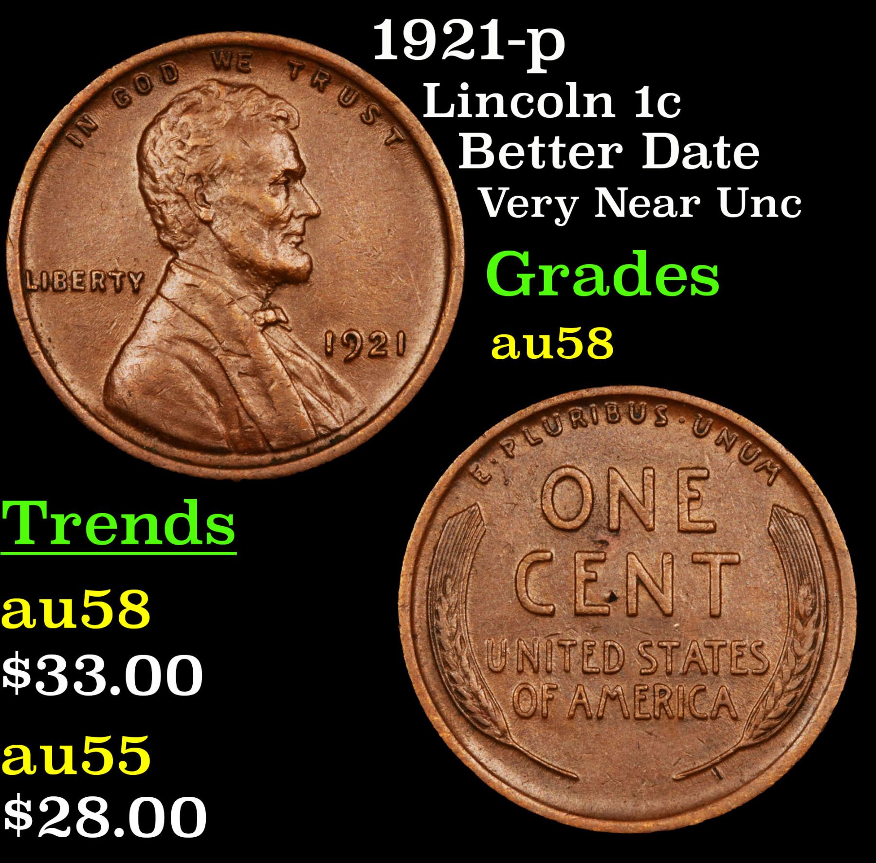 1921-p Lincoln Cent 1c Grades Choice AU/BU Slider.